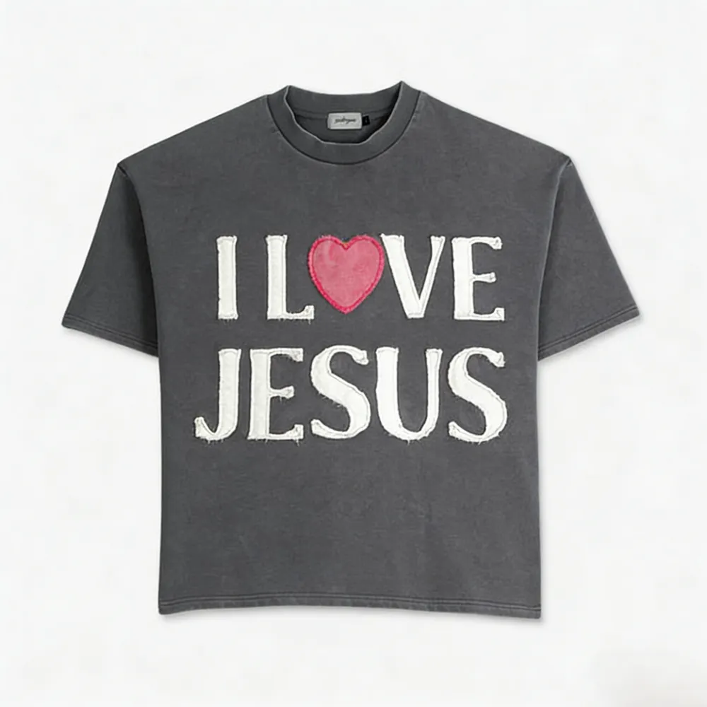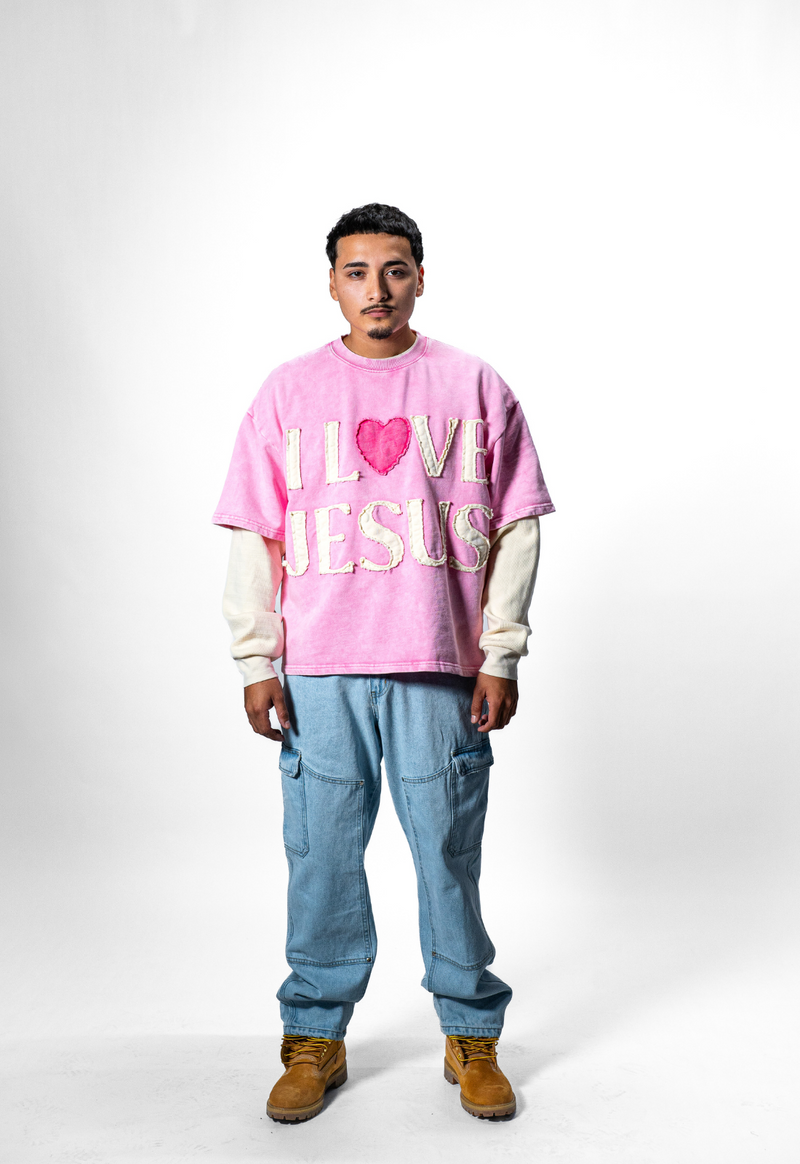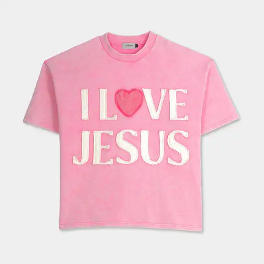 Emotionally Engaging Slogan: The words "I Love Jesus" are presented in white textured font, accented with soft pink hearts (replacing the word "love"), adding a gentle yet striking touch to the pale pink background.