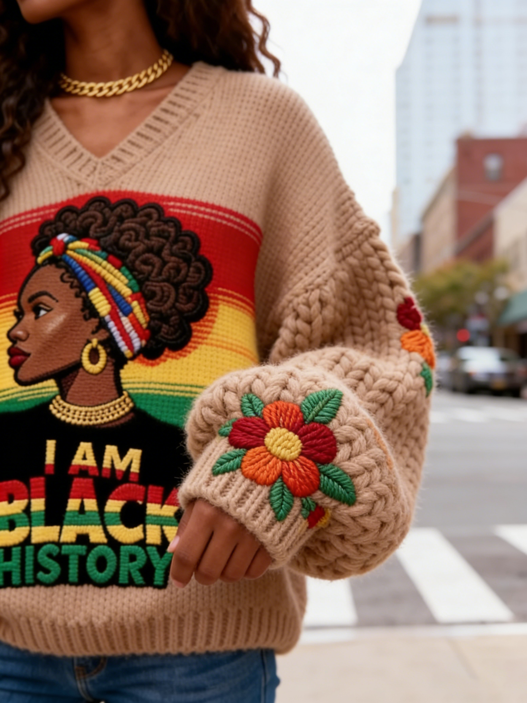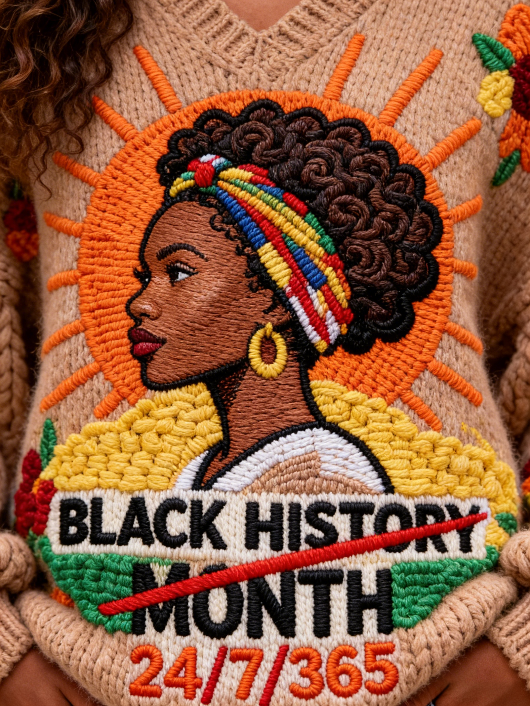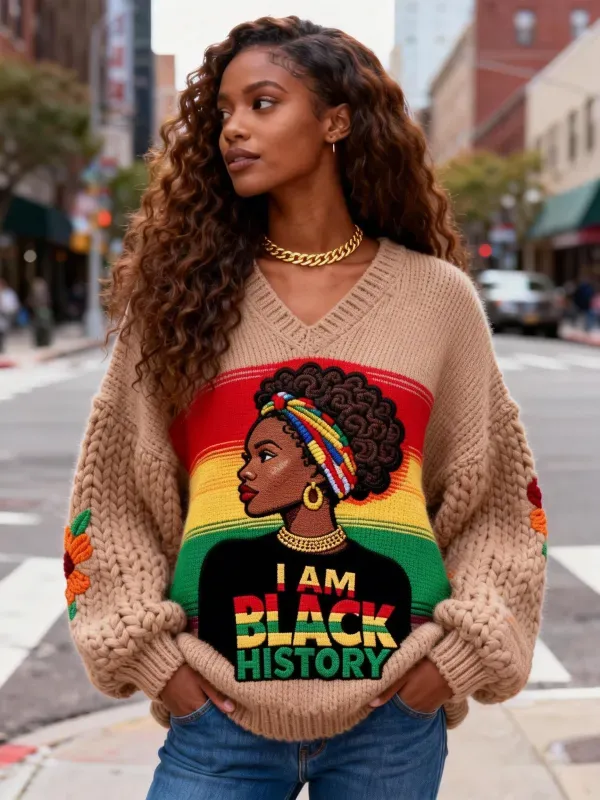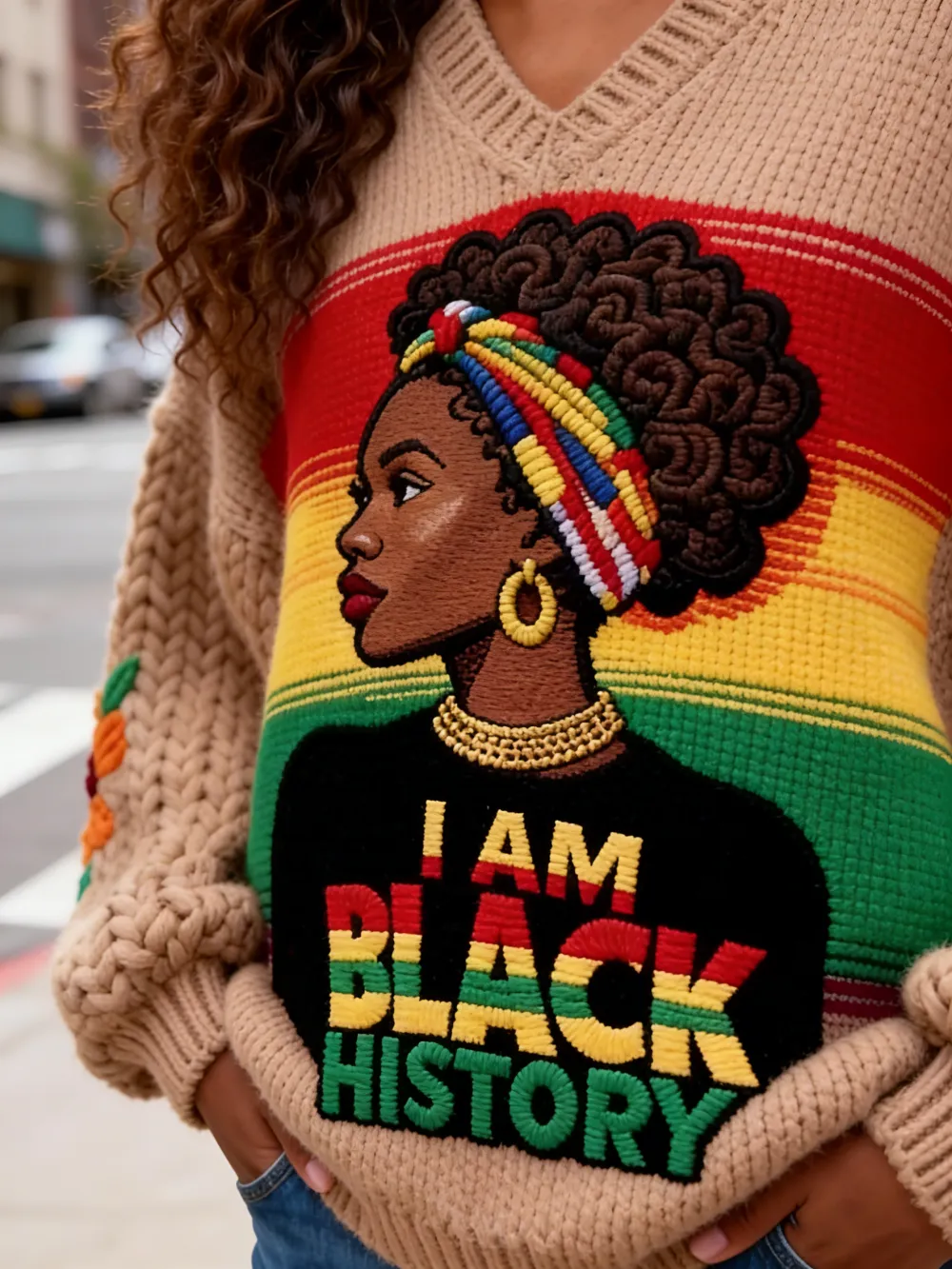 - A beige V-neck sweater with a colorful headscarf portrait embroidery and the slogan "I AM BLACK HISTORY" on the front.