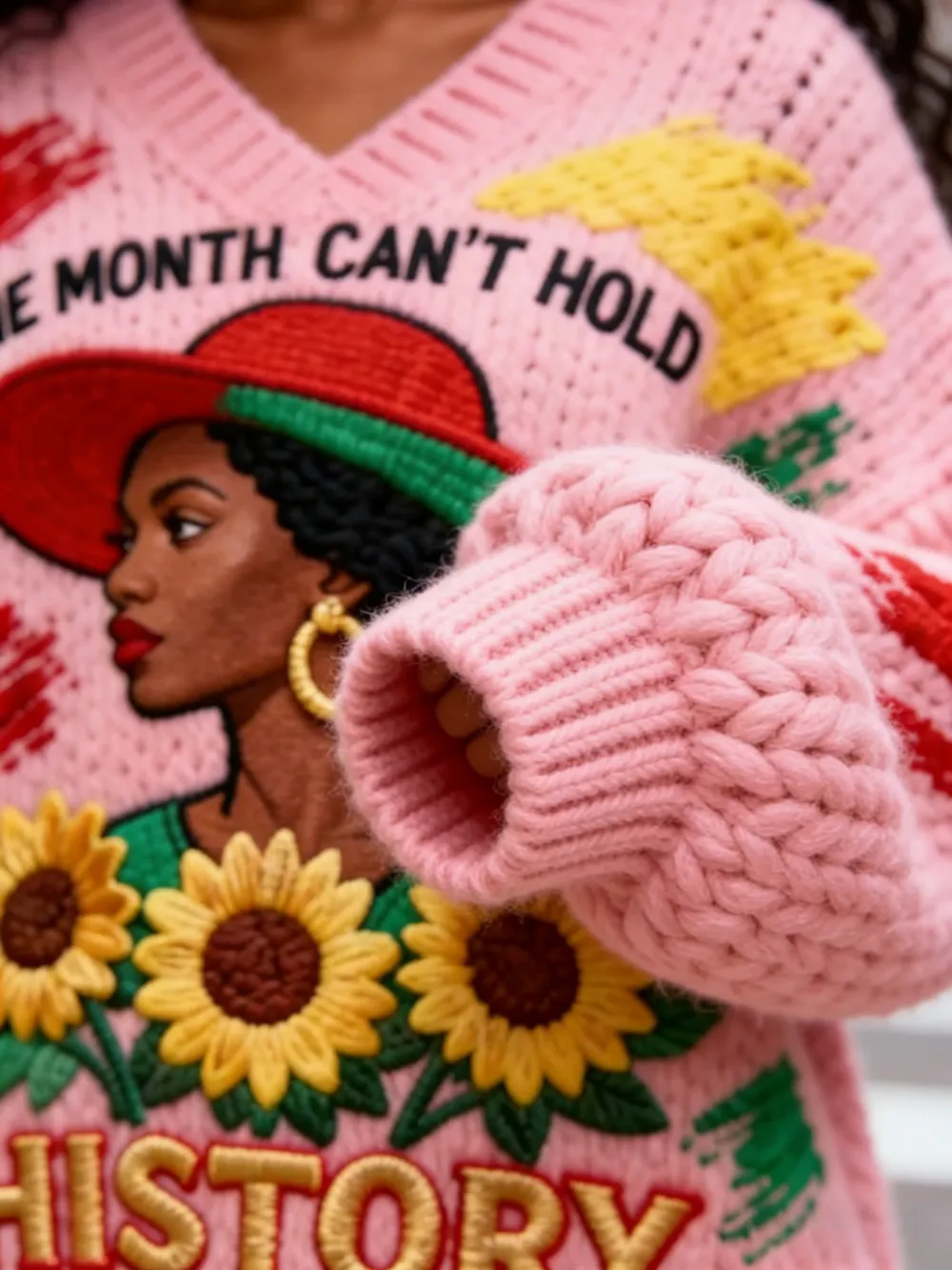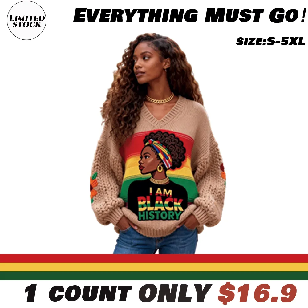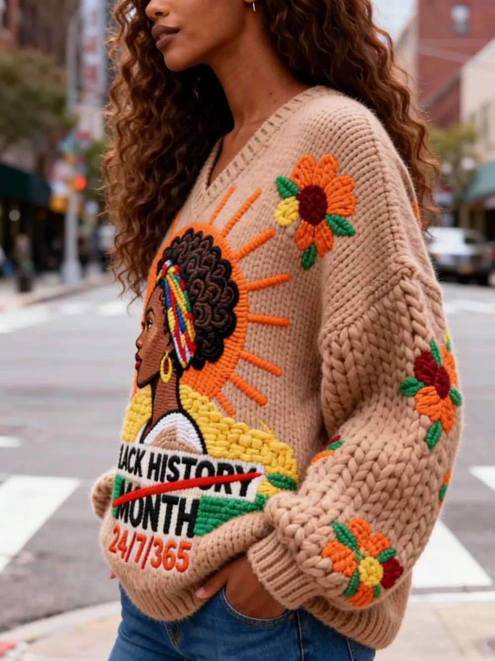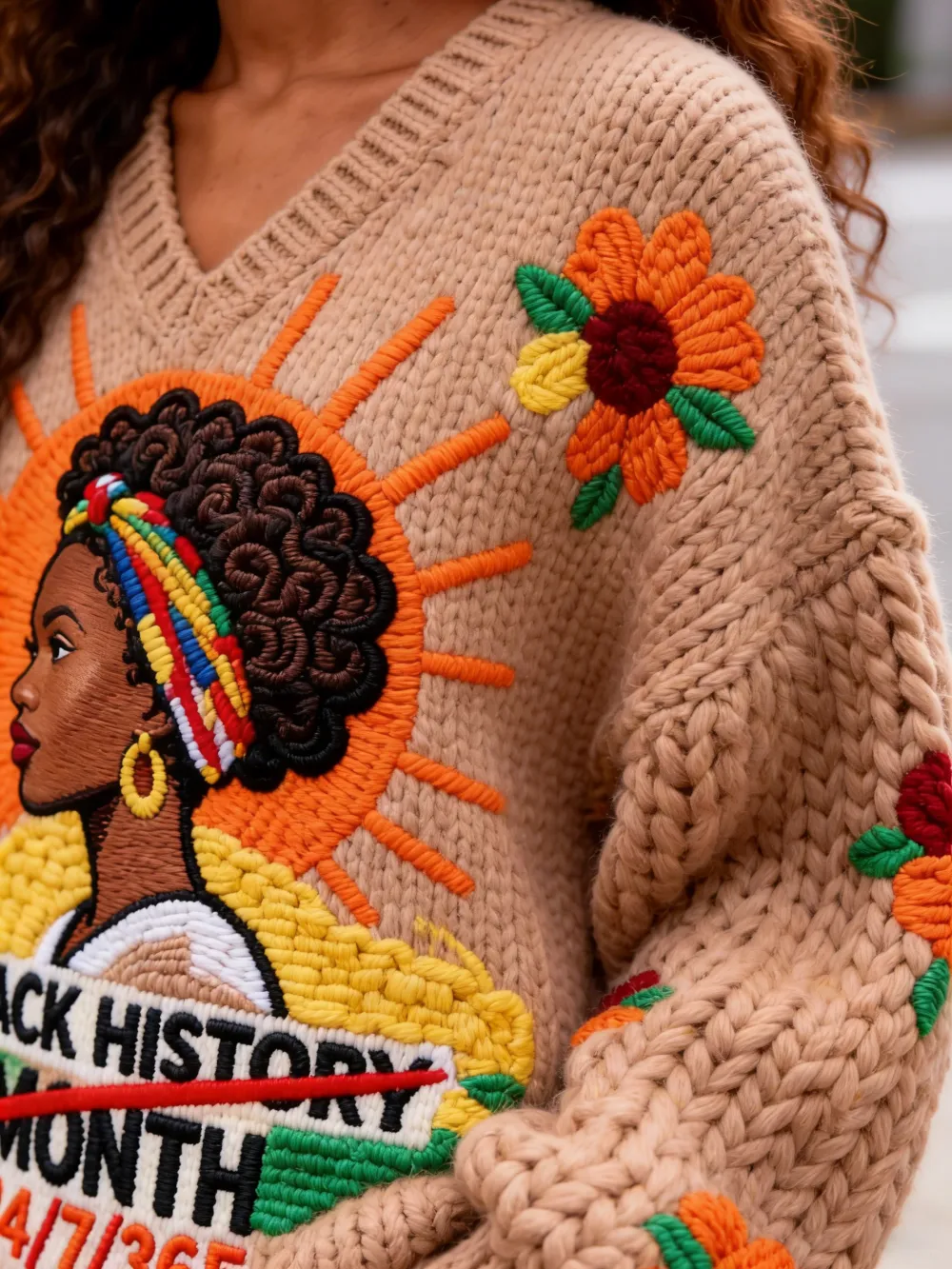 - A beige V-neck sweater with a colorful headscarf portrait embroidery and the slogan "I AM BLACK HISTORY" on the front.