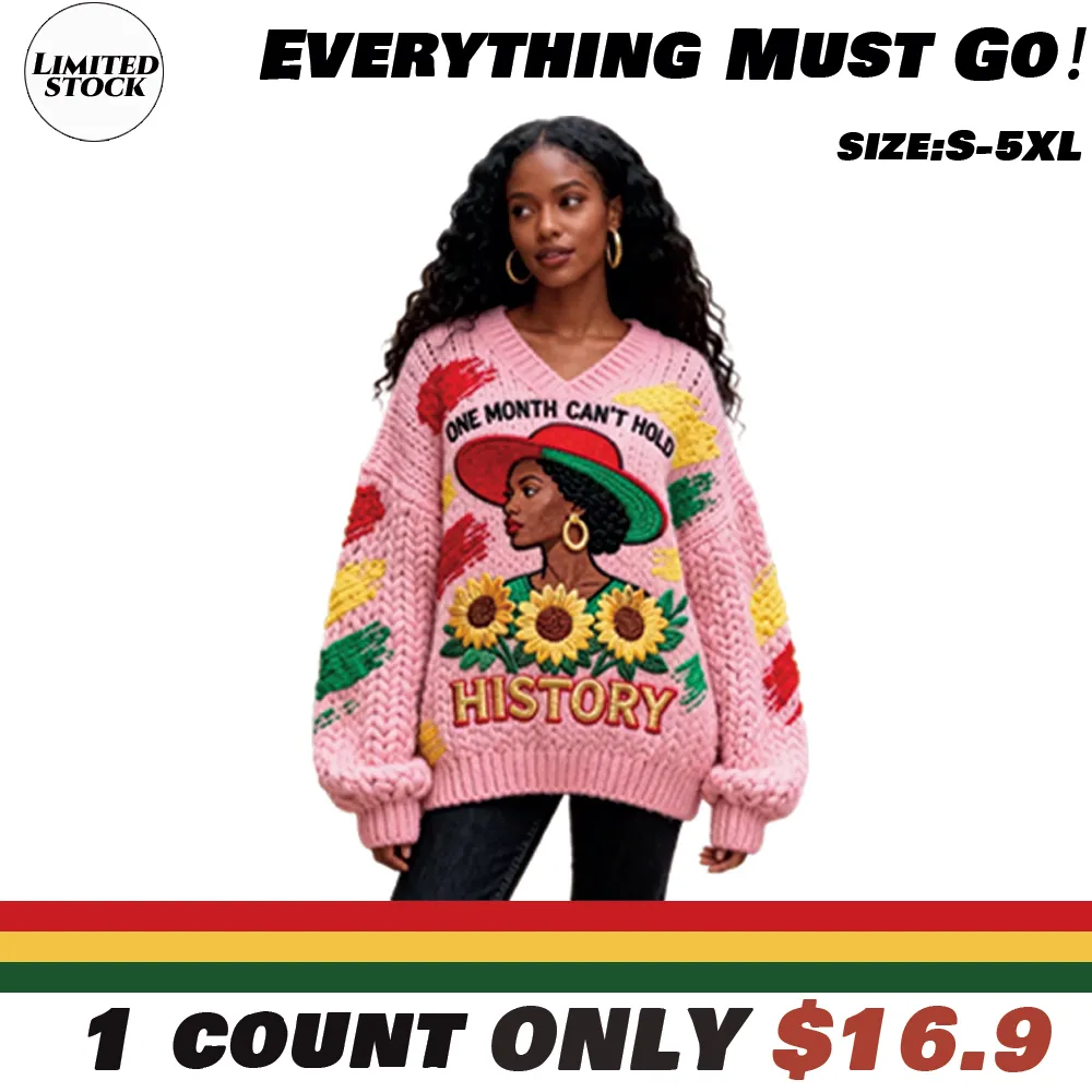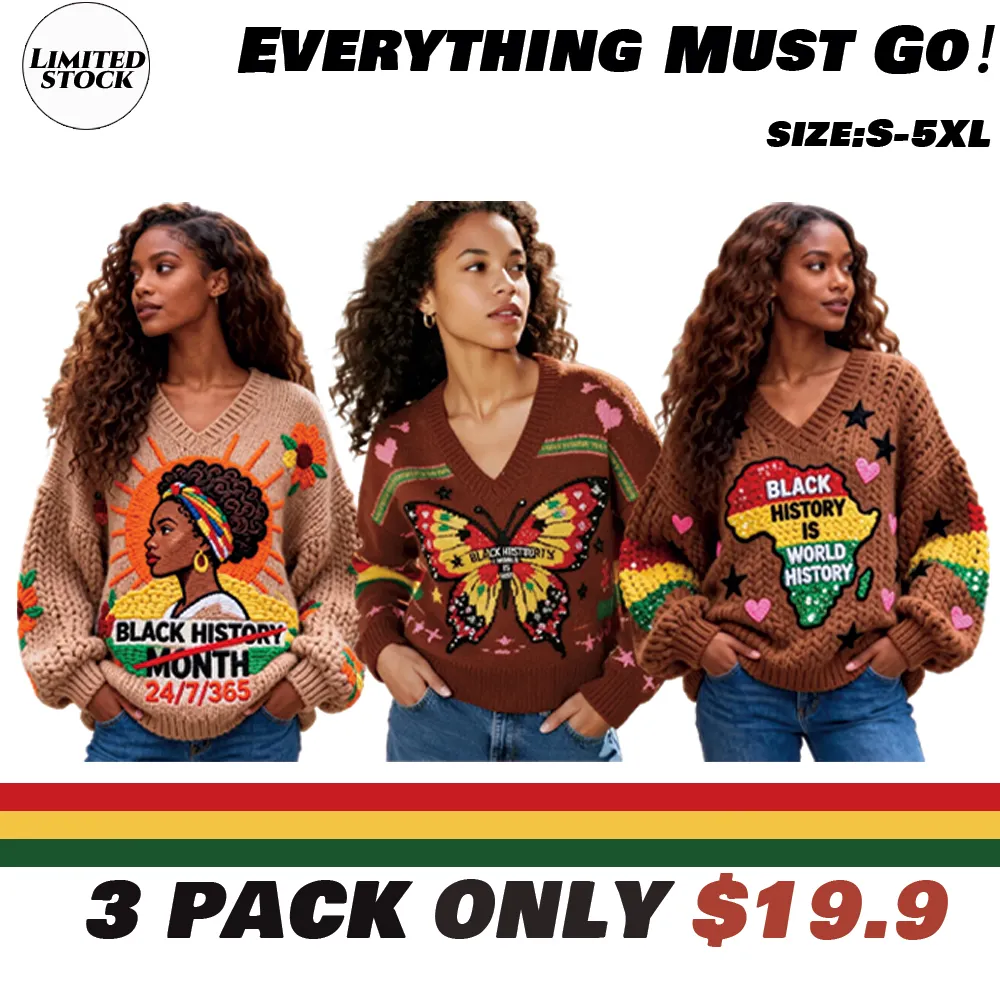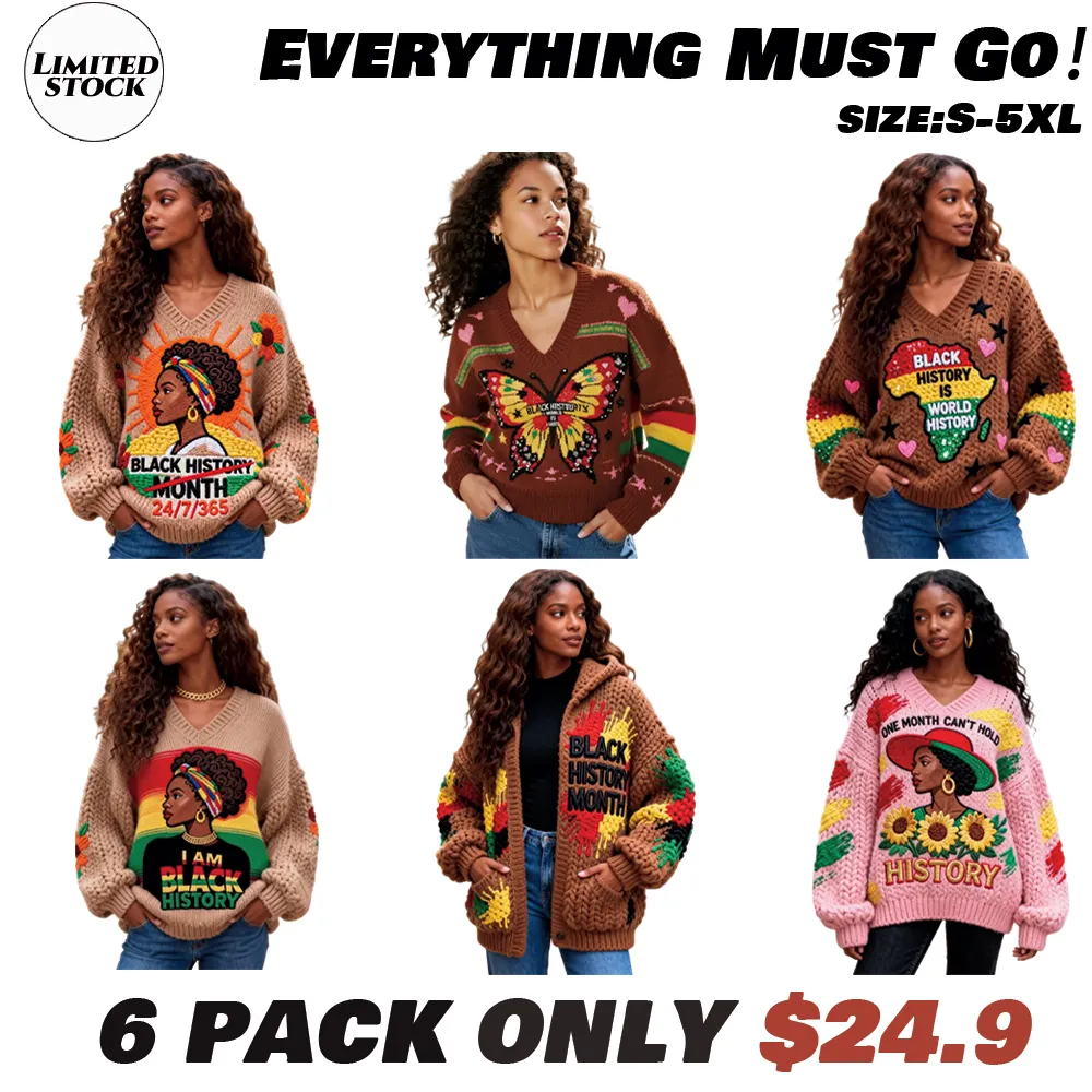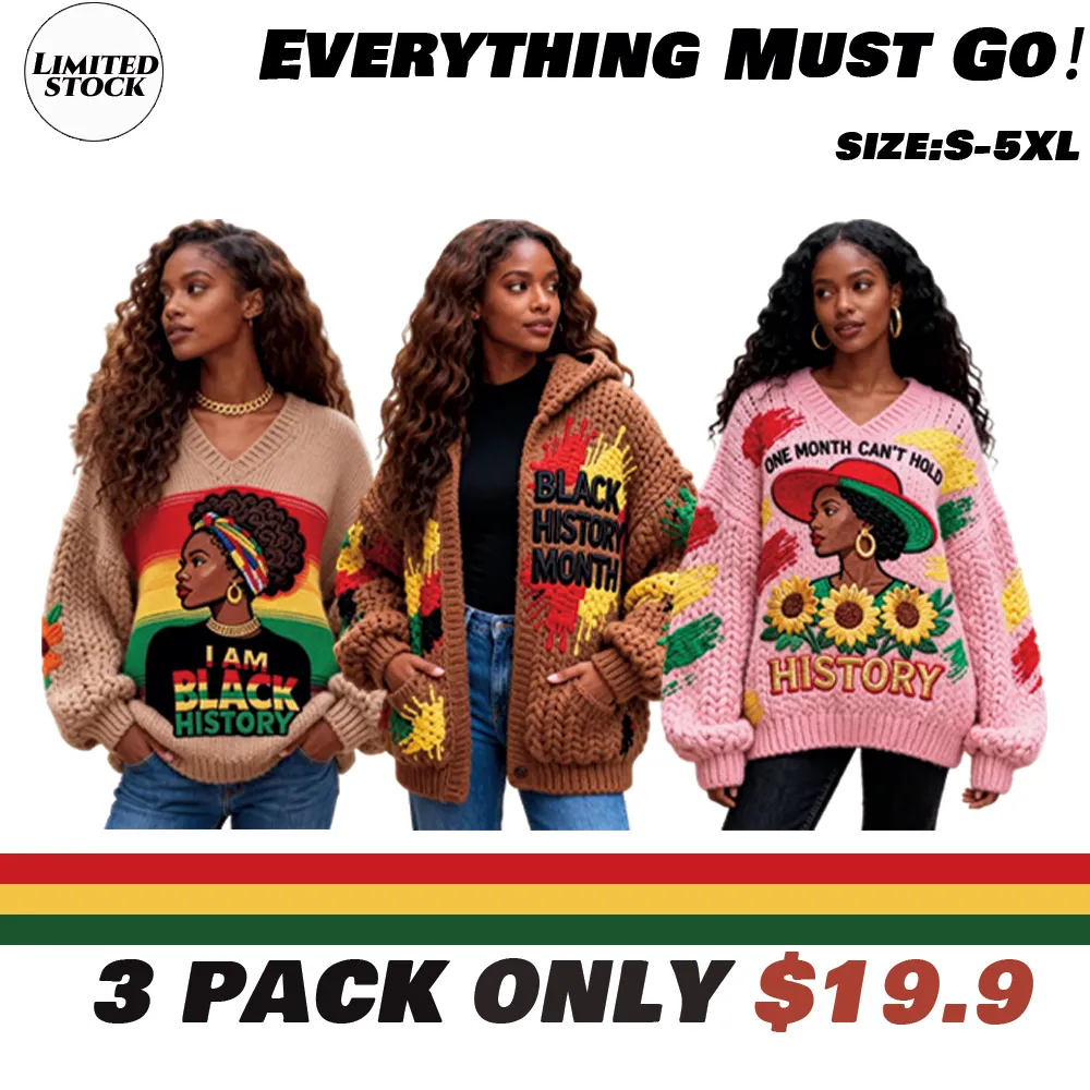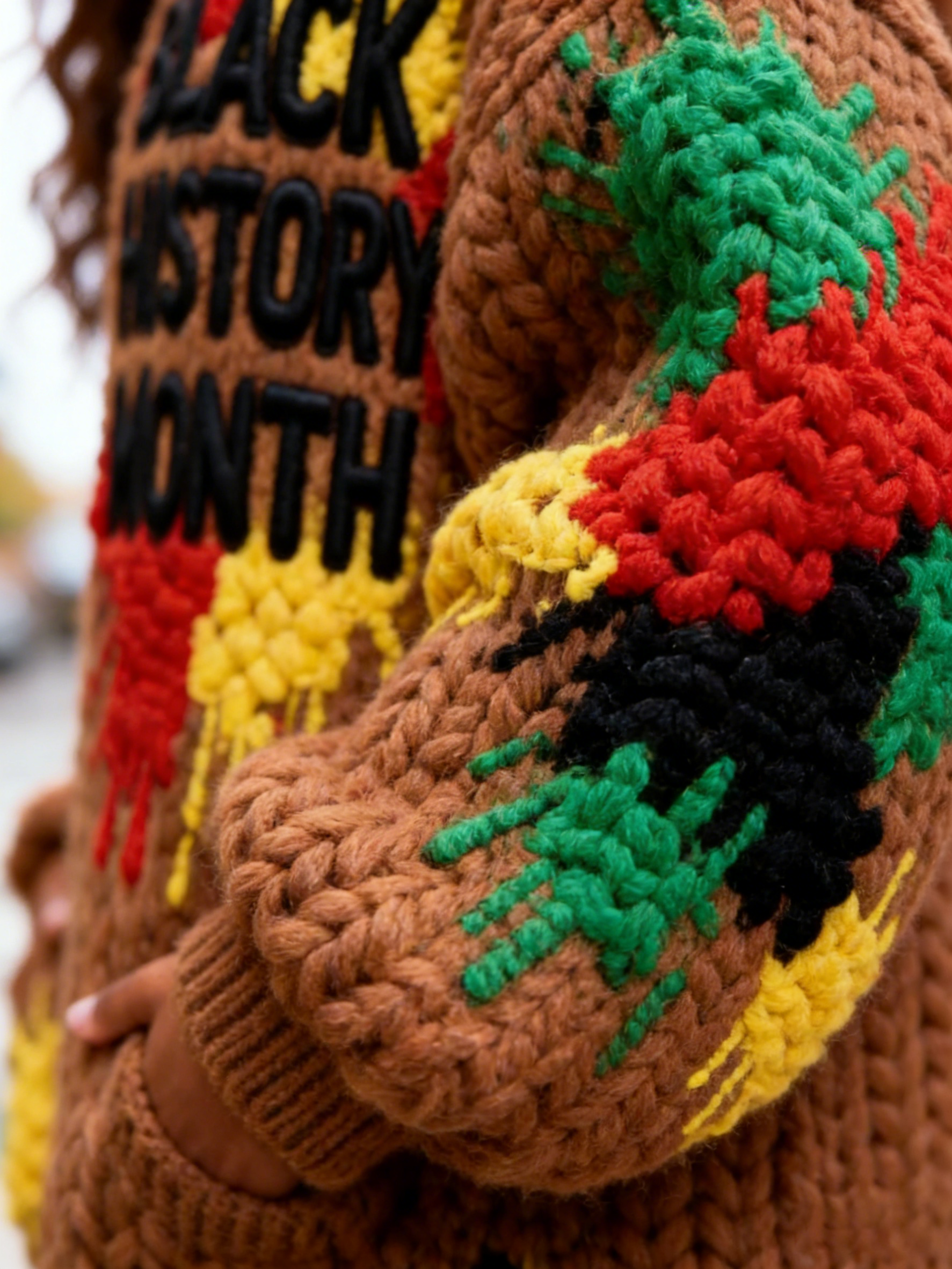 - A beige V-neck sweater with a colorful headscarf portrait embroidery and the slogan "I AM BLACK HISTORY" on the front.