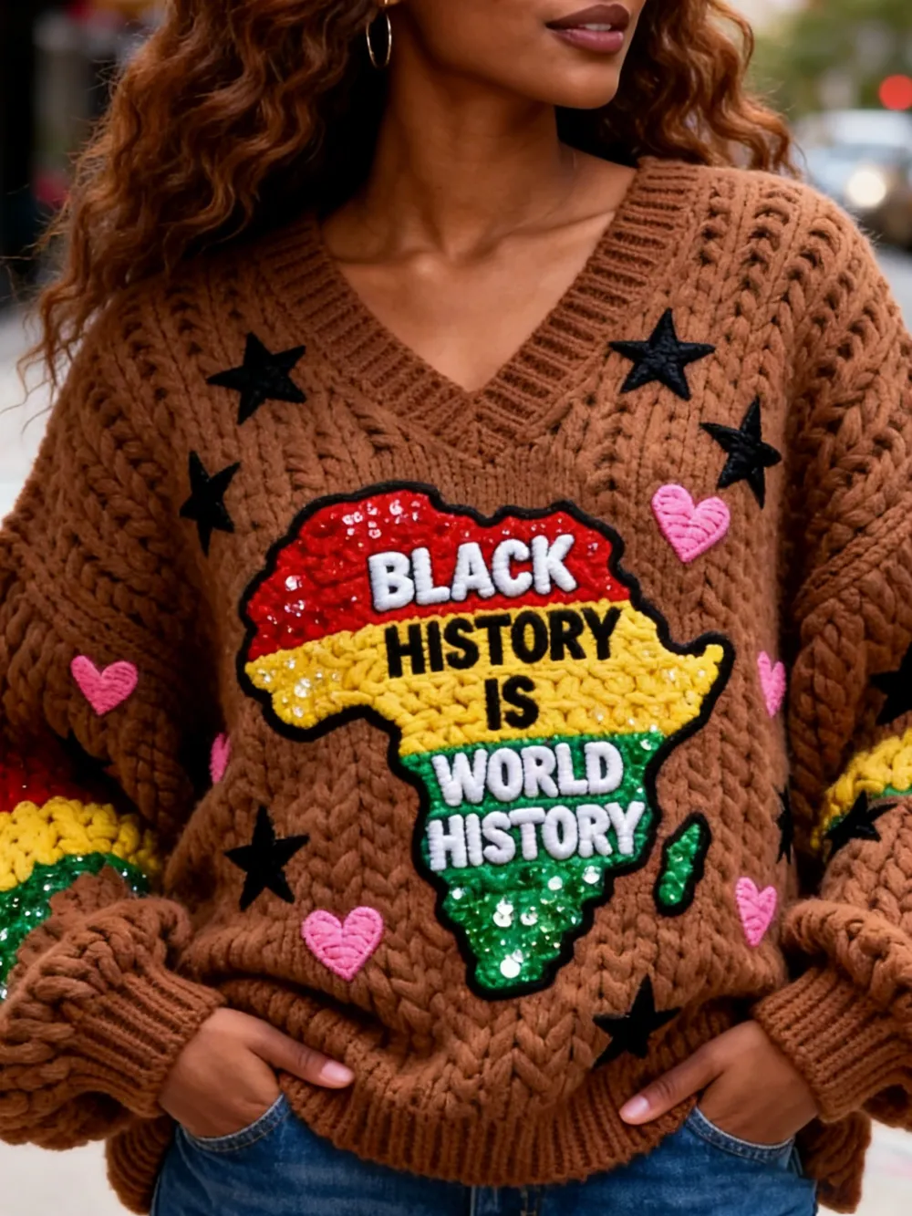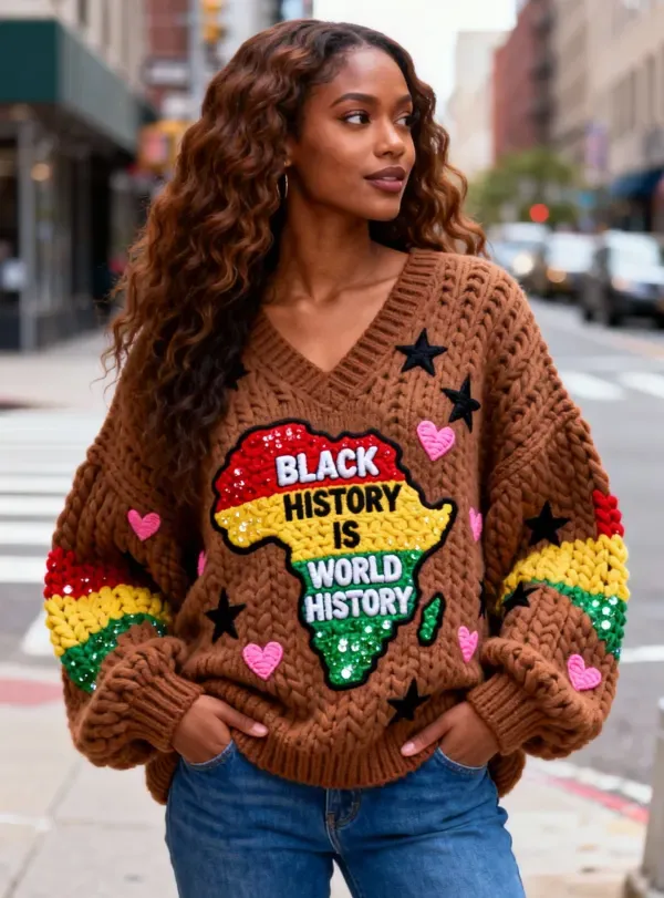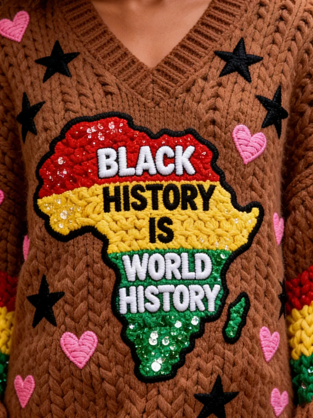 - A brown sweater featuring a vibrant sequin-embroidered African map and the powerful slogan "BLACK HISTORY IS WORLD HISTORY" on the front.