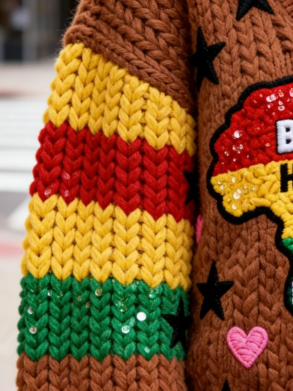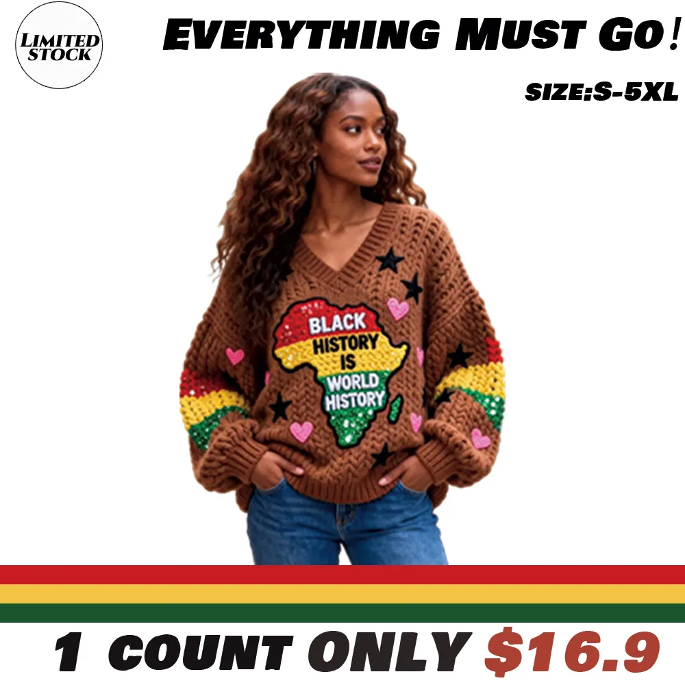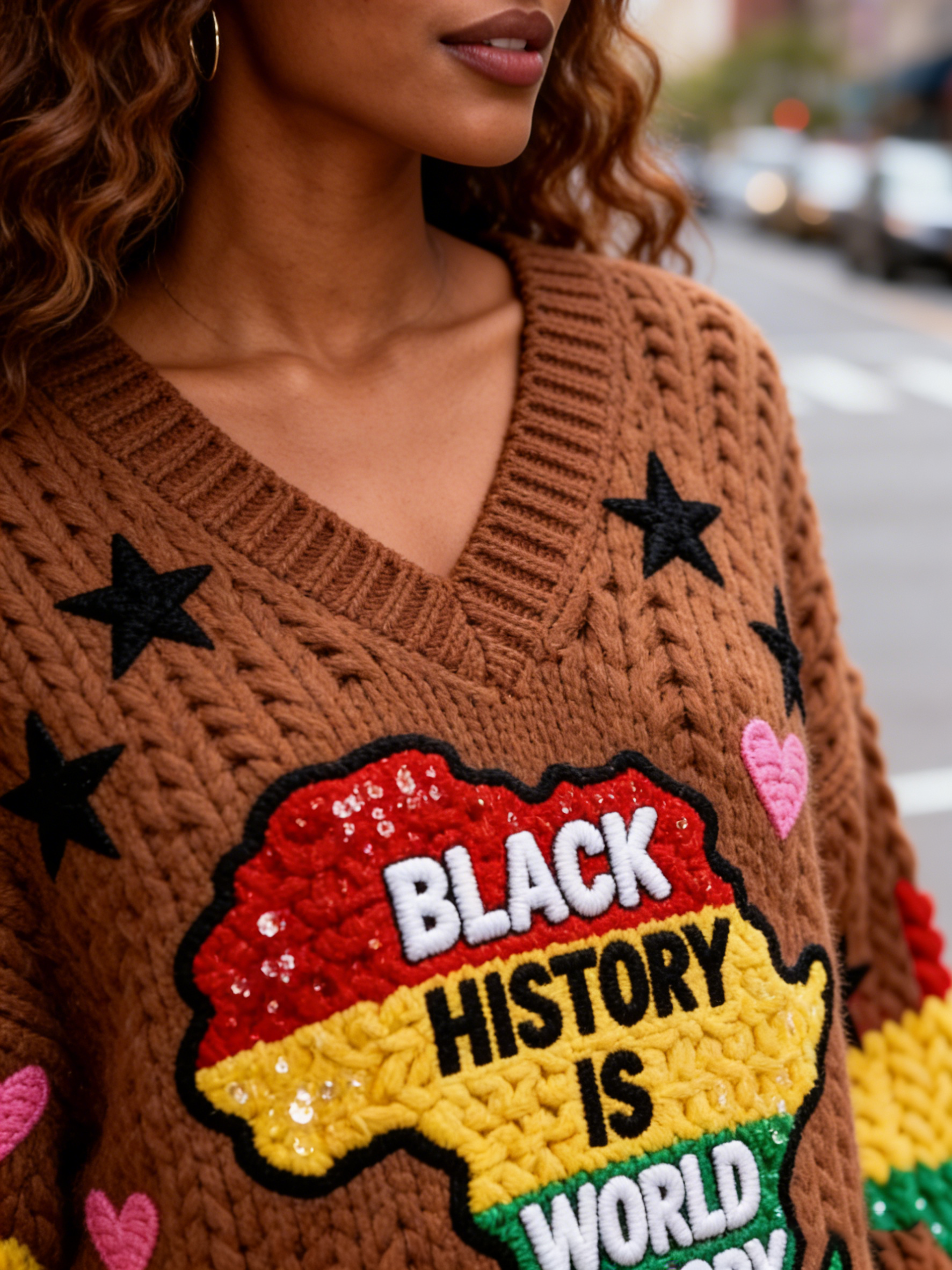 - A brown sweater featuring a vibrant sequin-embroidered African map and the powerful slogan "BLACK HISTORY IS WORLD HISTORY" on the front.