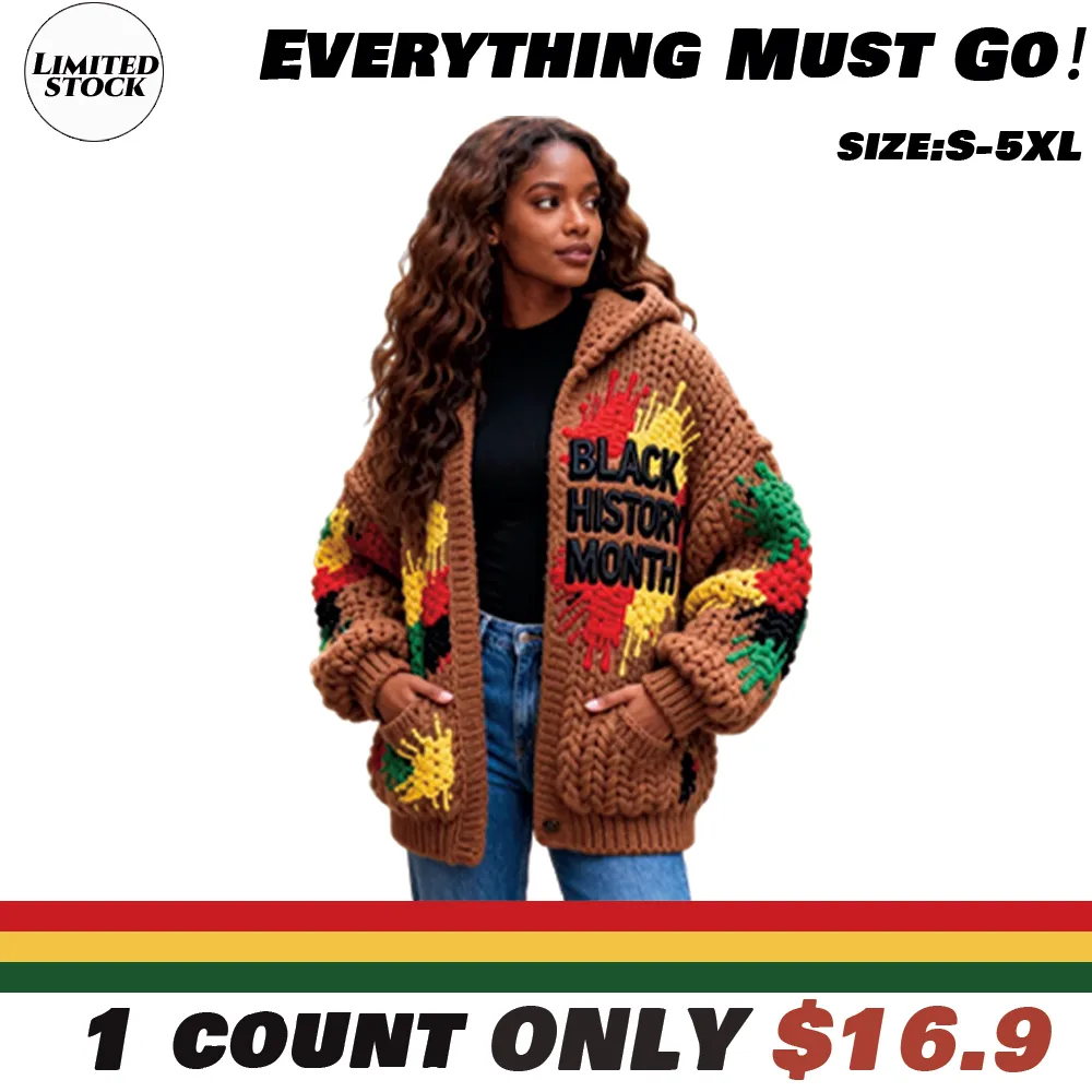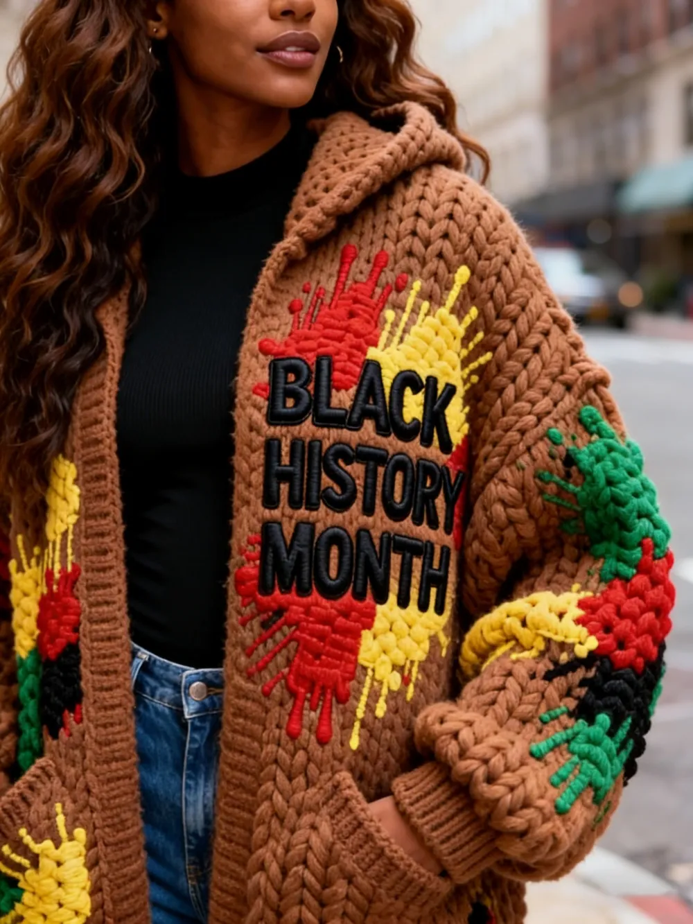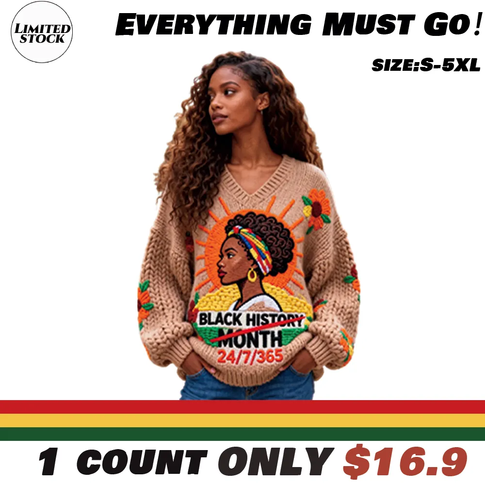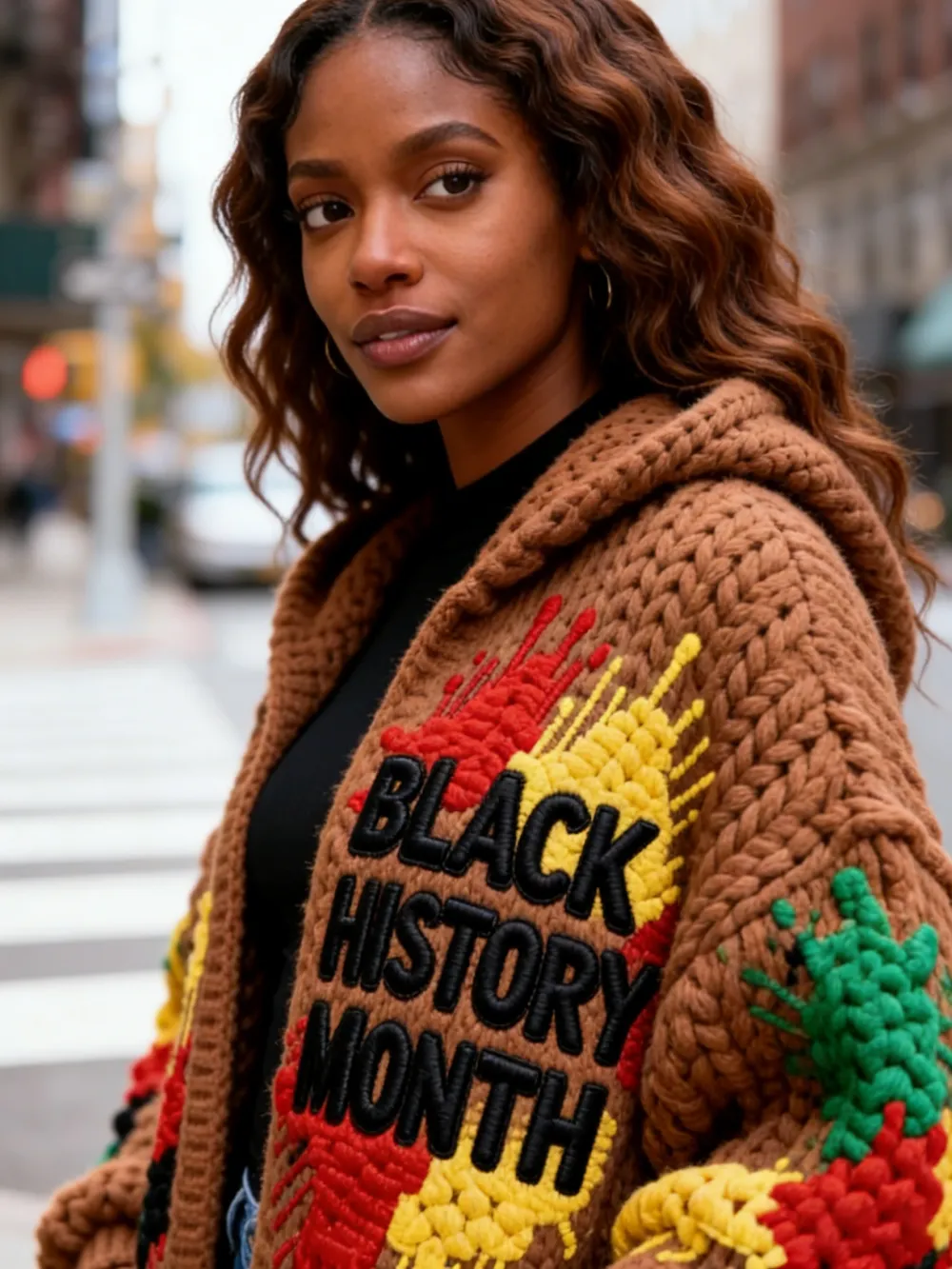 - The inspiring slogan "BLACK HISTORY MONTH 24/7/365" is stitched below the pattern, and the flower embroidery on the cuffs echoes the cultural theme seamlessly.