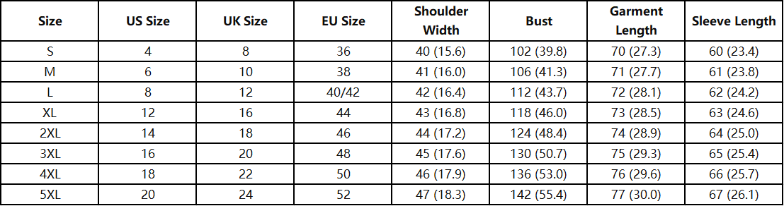 - Sleeve Length: Measure from the shoulder seam to the end of the cuff.