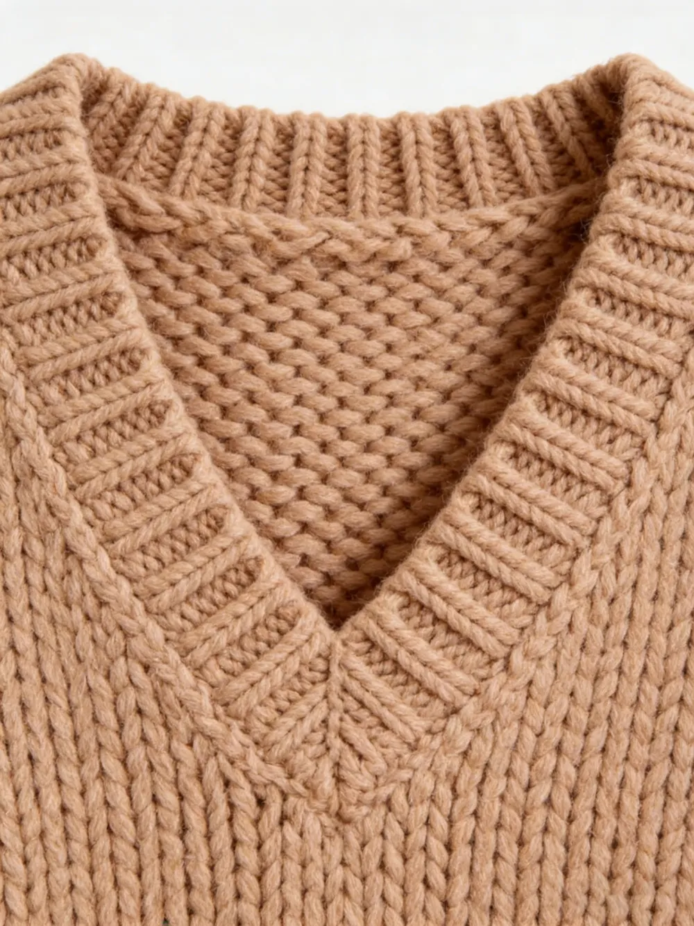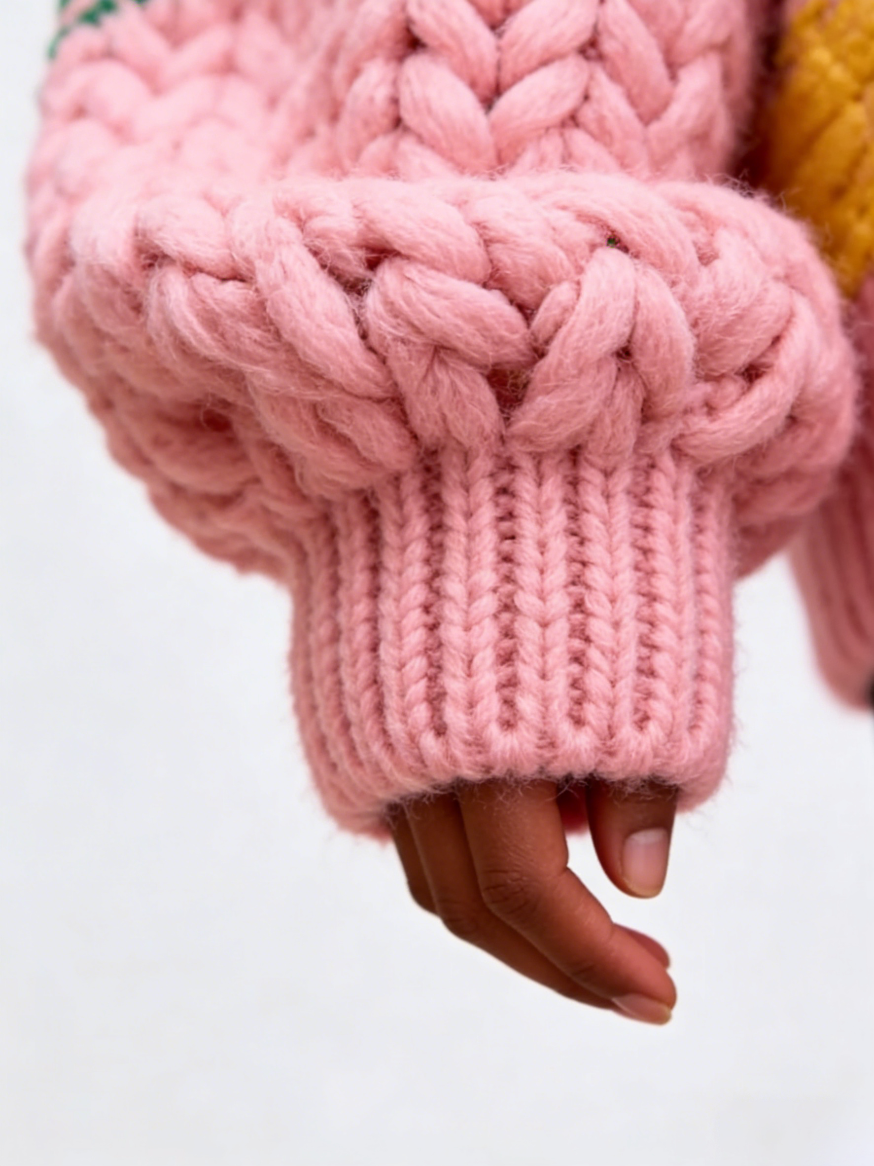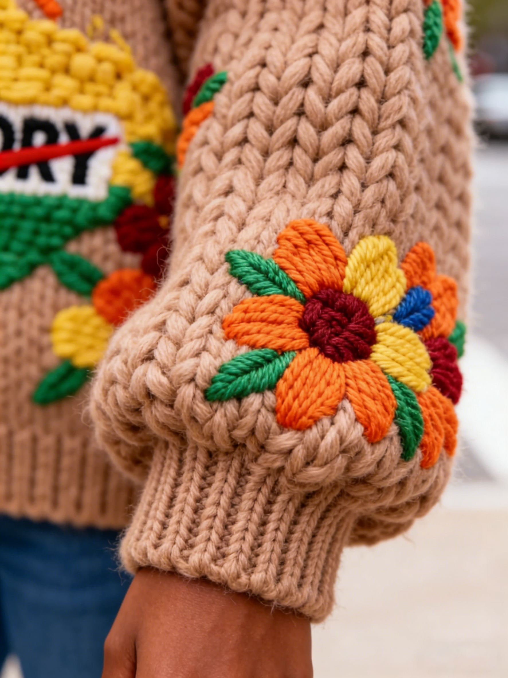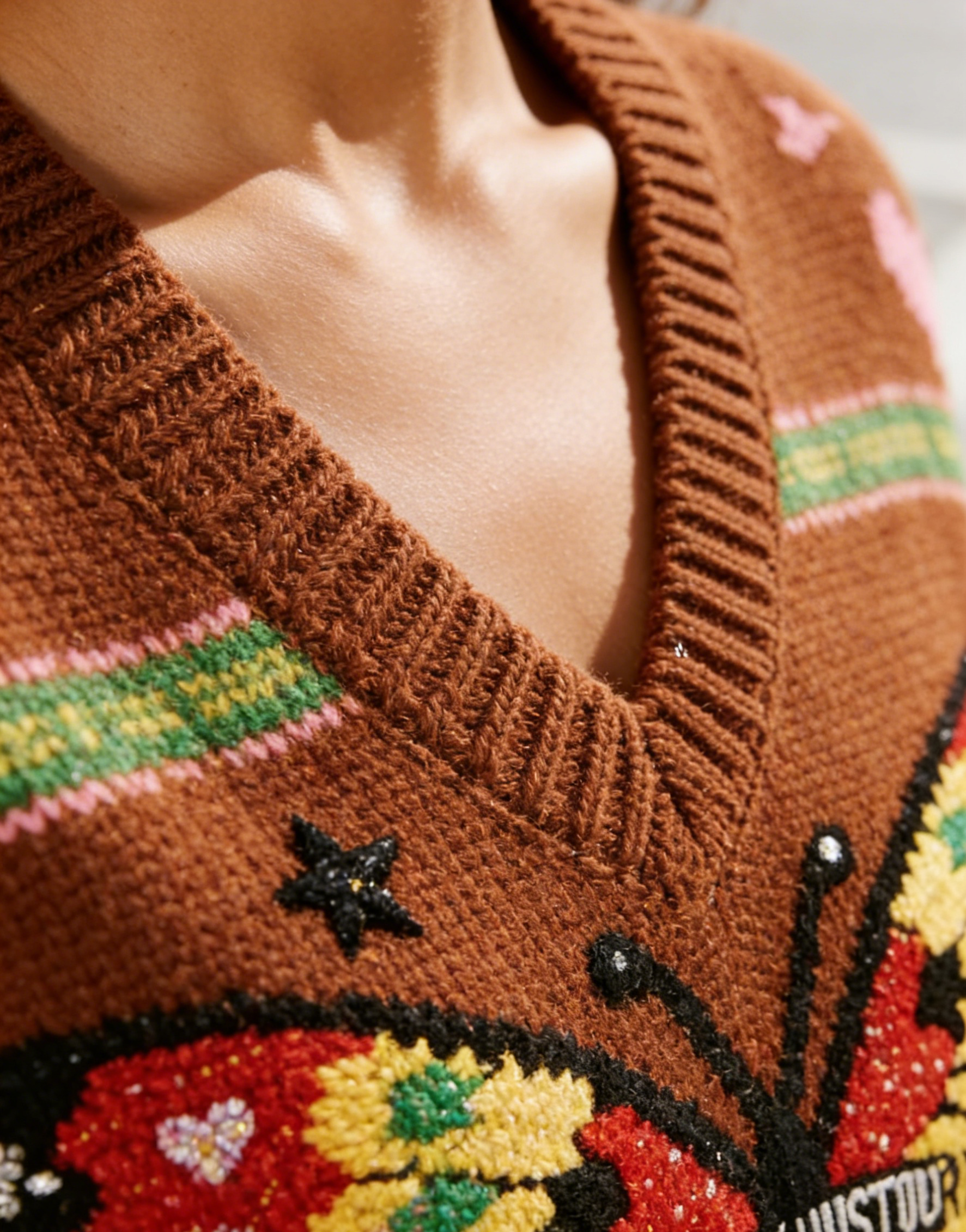 - A beige V-neck sweater with a headscarf portrait surrounded by sunflower embroidery on the front.