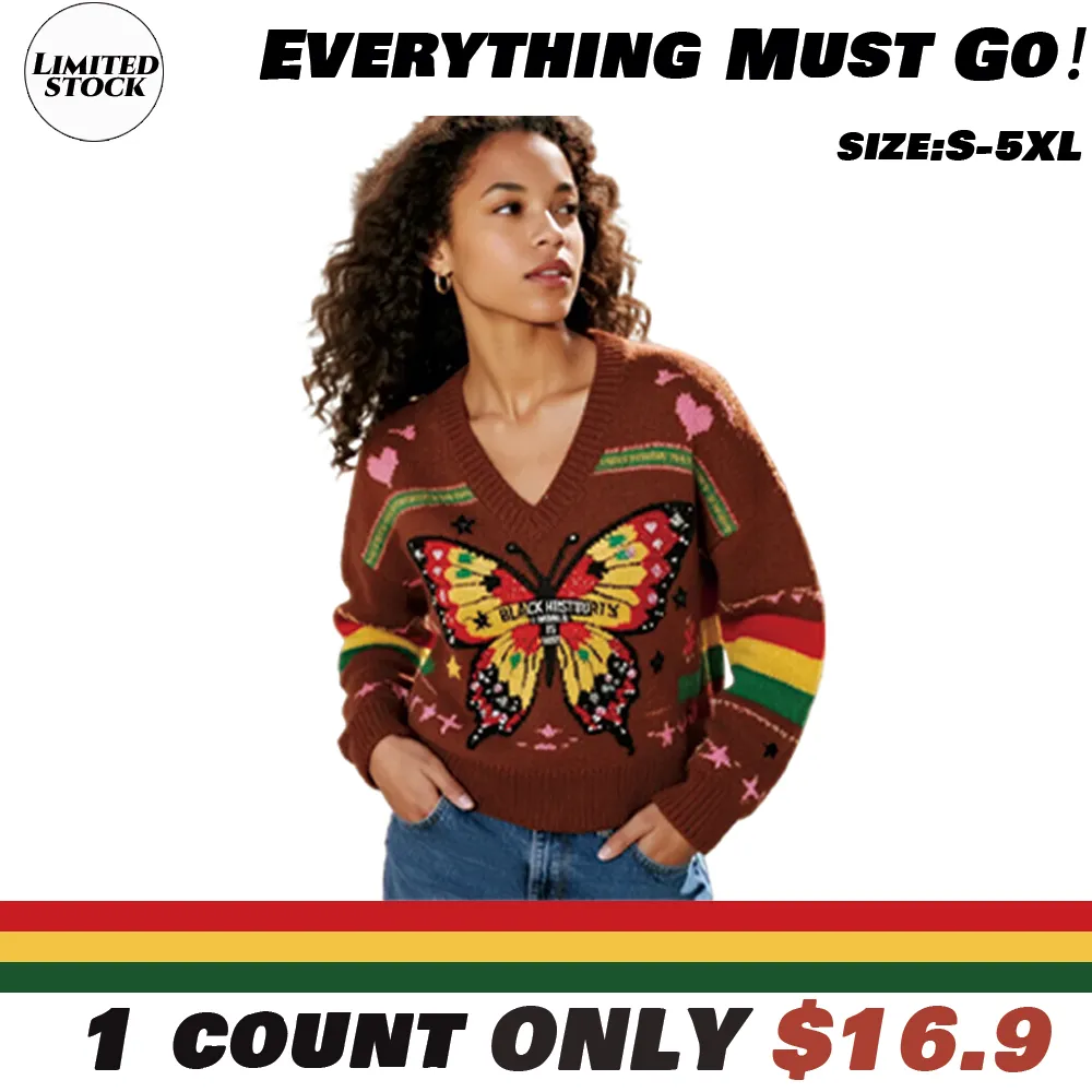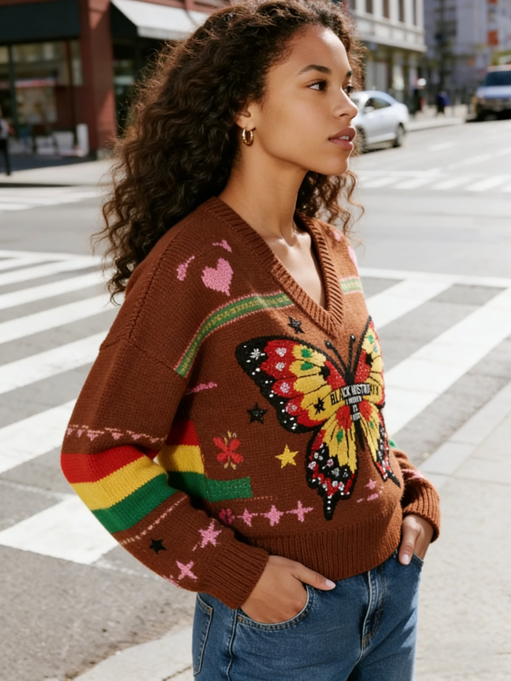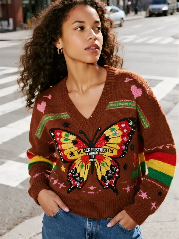 - A cropped brown sweater with a colorful butterfly embroidery at the center, paired with the slogan "BLACK HISTORY".