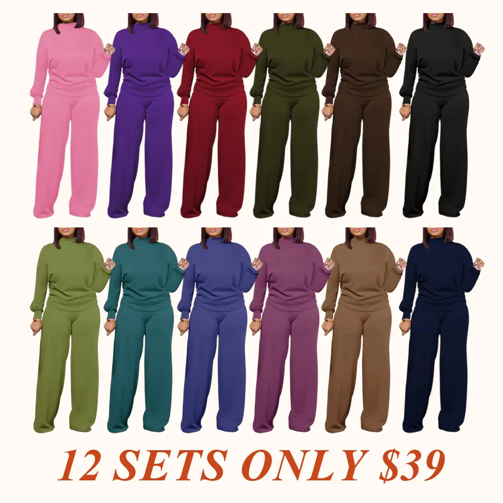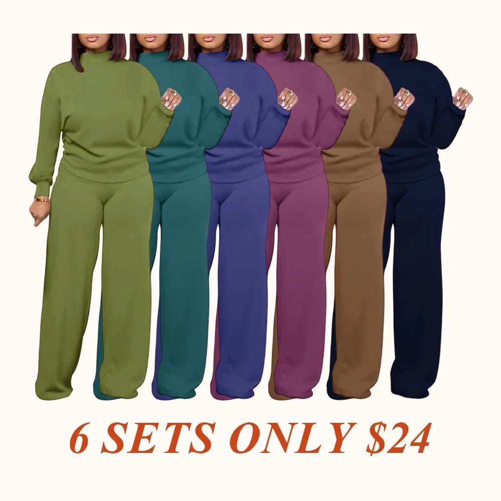 Women's Chic Fall Winter Silky Soft 2-Piece Set - Long Sleeve Semi High Neck Loose Top & Wide Leg Pants
