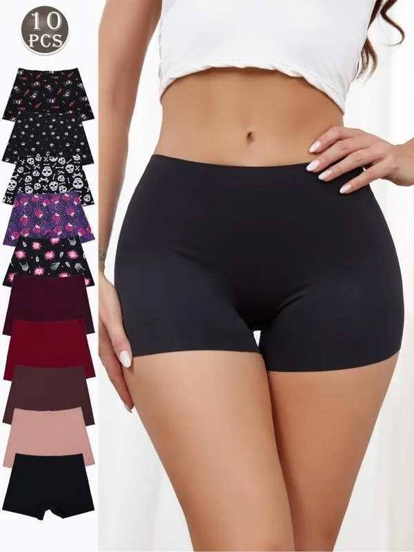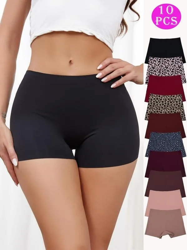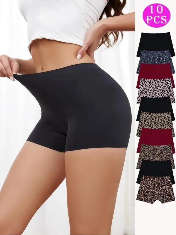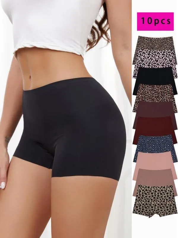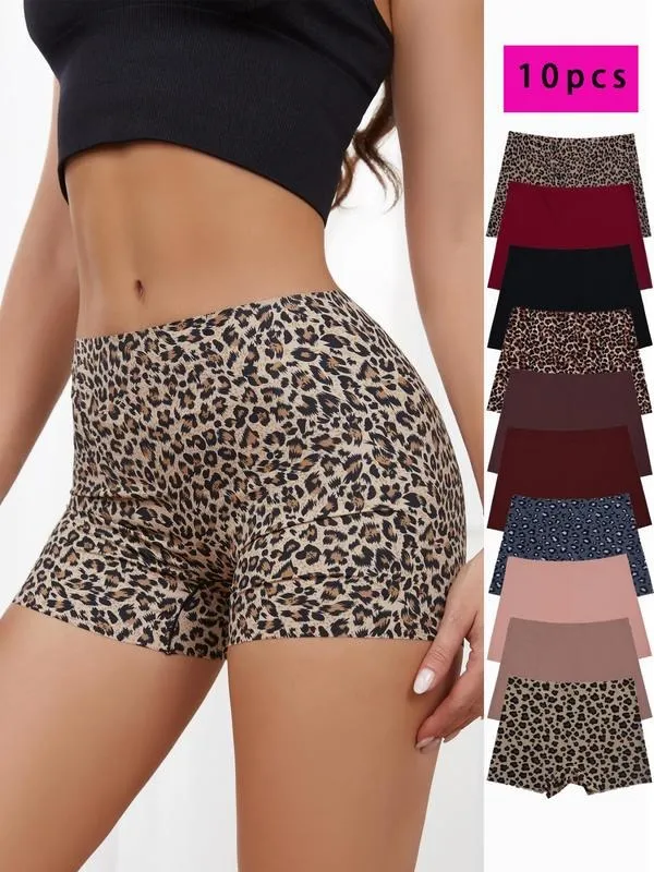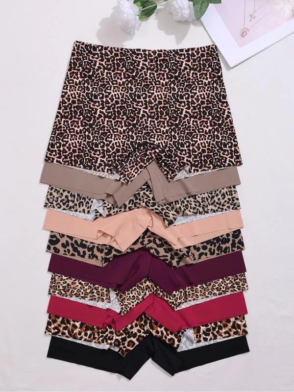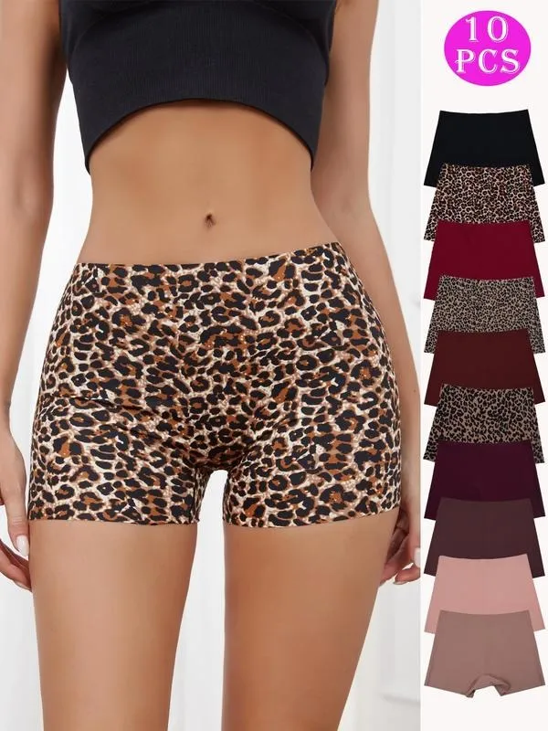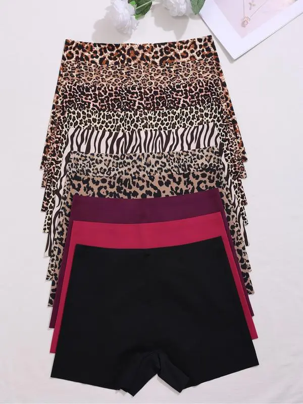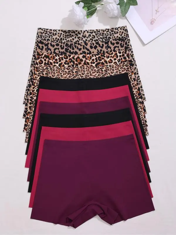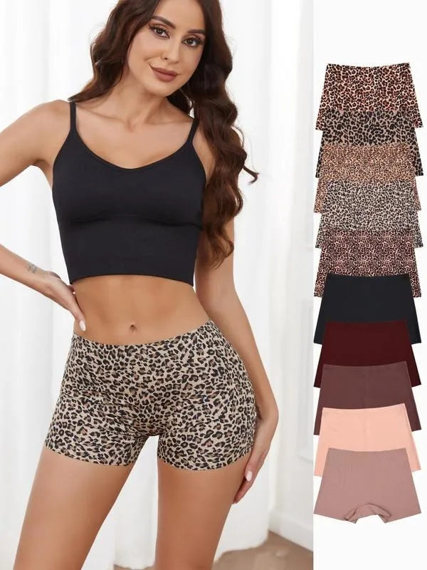 Women's Leopard Print Seamless Boyshorts, Casual Solid Color Natural Waist Panties Set
